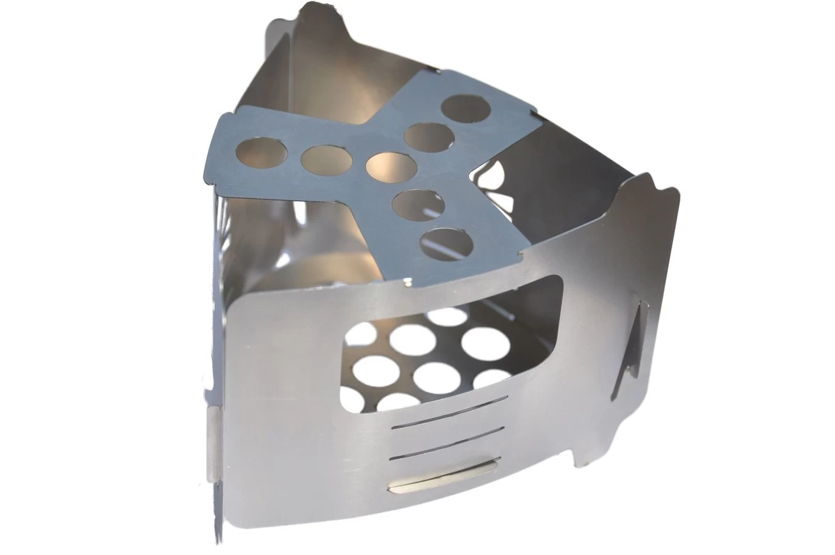 Il est fabriqué à partir d’acier inoxydable de 0,3 mm d’épaisseur. Il est composé 5 éléments qui s’assemblent pour former le réchaud. Le montage est facile, rapide et ingénieux. En effet le système d’encoches permet d’obtenir un réchaud solidement formé (malgré la légèreté) et stable.