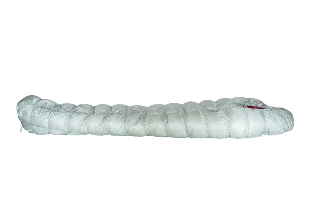 L’enveloppe du sac de couchage G400 est un tissu en Pertex Quantum Ripstop traité DWR contre l’humidité. La fermeture éclair semi-automatique de 3 millimètres remonte sur le dessus. Cela permet de l’atteindre plus facilement, notamment la nuit dans le noir, mais surtout, d’obtenir une construction plus anatomique au niveau des épaules, ne nécessitant pas de velcro pour fermer l’ouverture. Muni d’un bloqueur, une fois celui-ci enclenché, le curseur de la fermeture eclair ne coulisse plus. Sur le pourtour du visage, l’isolation est assurée en fibre synthétique Climashield. Celle-ci est plus adaptée à l’humidité expirée durant la nuit, et elle ajoute un confort supplémentaire au niveau du cordon de la capuche.