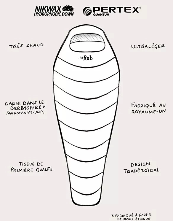 Les cloisons en forme de trapèze limitent au maximum les déperditions. Ses compartiments en croissant vers le bas permettent de maintenir le duvet au centre du corps et de garantir un bon niveau de chaleur. Sa forme momie et son espace angulaire pour les pieds le rendent très spacieux pour son poids.