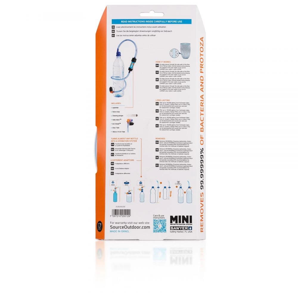 Fonctionnement : l’eau traverse le système de filtration micro-fibreux qui empeche les bactéries et les protozoaires de passer. Vous pourrez ainsi boire une eau saine. Le mini filtre filtre jusqu’à 300.000 litres d’eau. Le Sawyer est résistant et peut-être lavé : il ne nécessite aucune cartouche de remplacement.