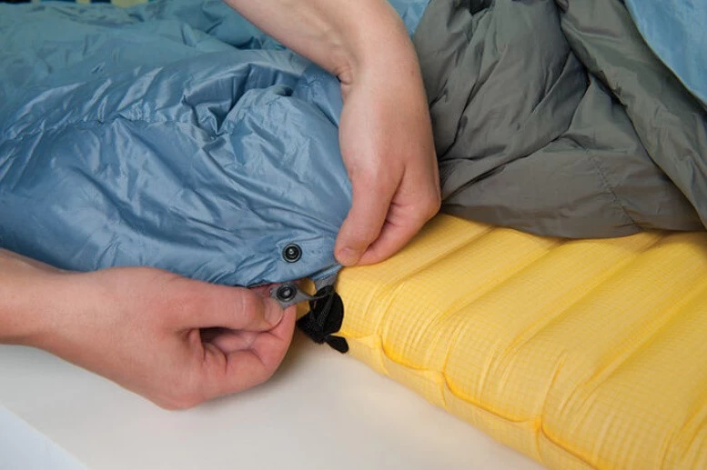 Des boutons pressions sont situés sur les côtés de la couette. Ils permettent de la fixer au matelas grâce au kit Mattress Loop (vendu séparément). Les personnes disposent chacun d’une petit poche zippée placé sur la face extérieure. Elle est fournie avec une housse de rangement et un sac de transport.